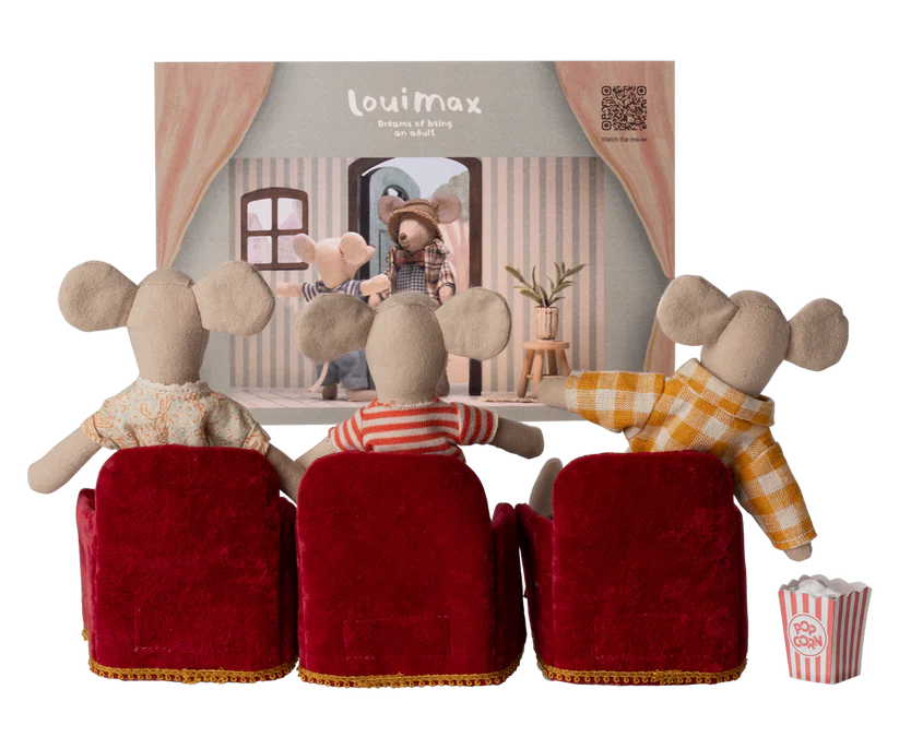 Le kit comprend un « écran de cinéma » avec le QR code du film, 3 fauteuils, 3 souris du film et une feuille de boîtes à pop-corn DIY, pour souris.